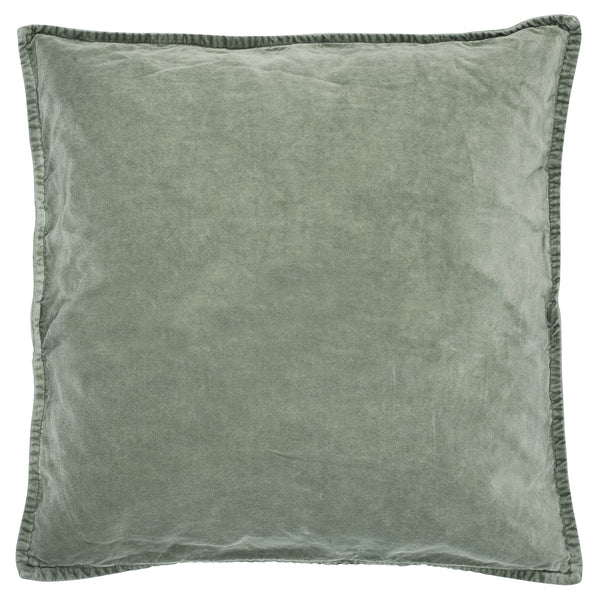 Cotton velvet cushion with a feather filling in a washed olive green.