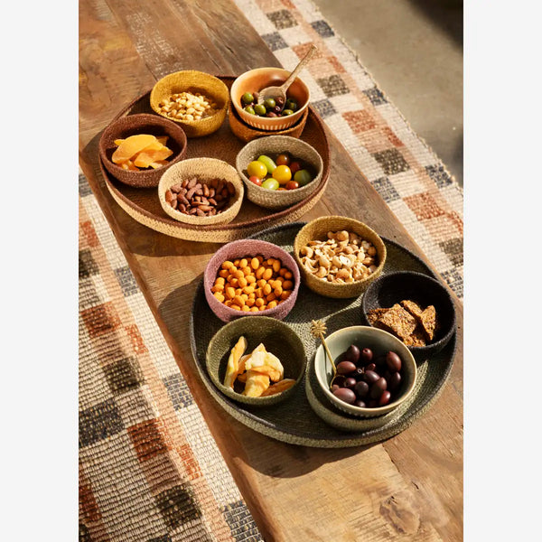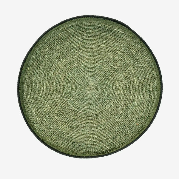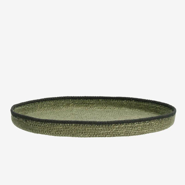 Round seagrass tray in green and black.